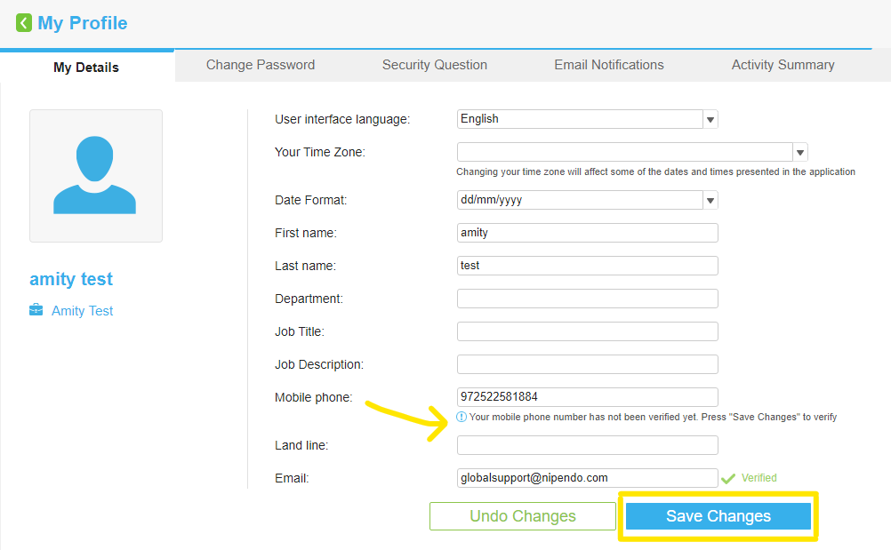 2. Under the mobile phone field, the following message will appear: "Your mobile phone number has not been verified yet. Press "Save Changes" to verify."